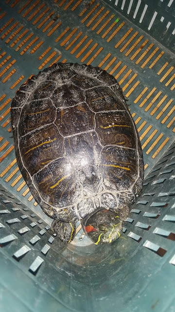 Esta tortuga fue encontrada en el río, la pobre quería salir de esa caja. Un niño le dio un trozo de salchicha...